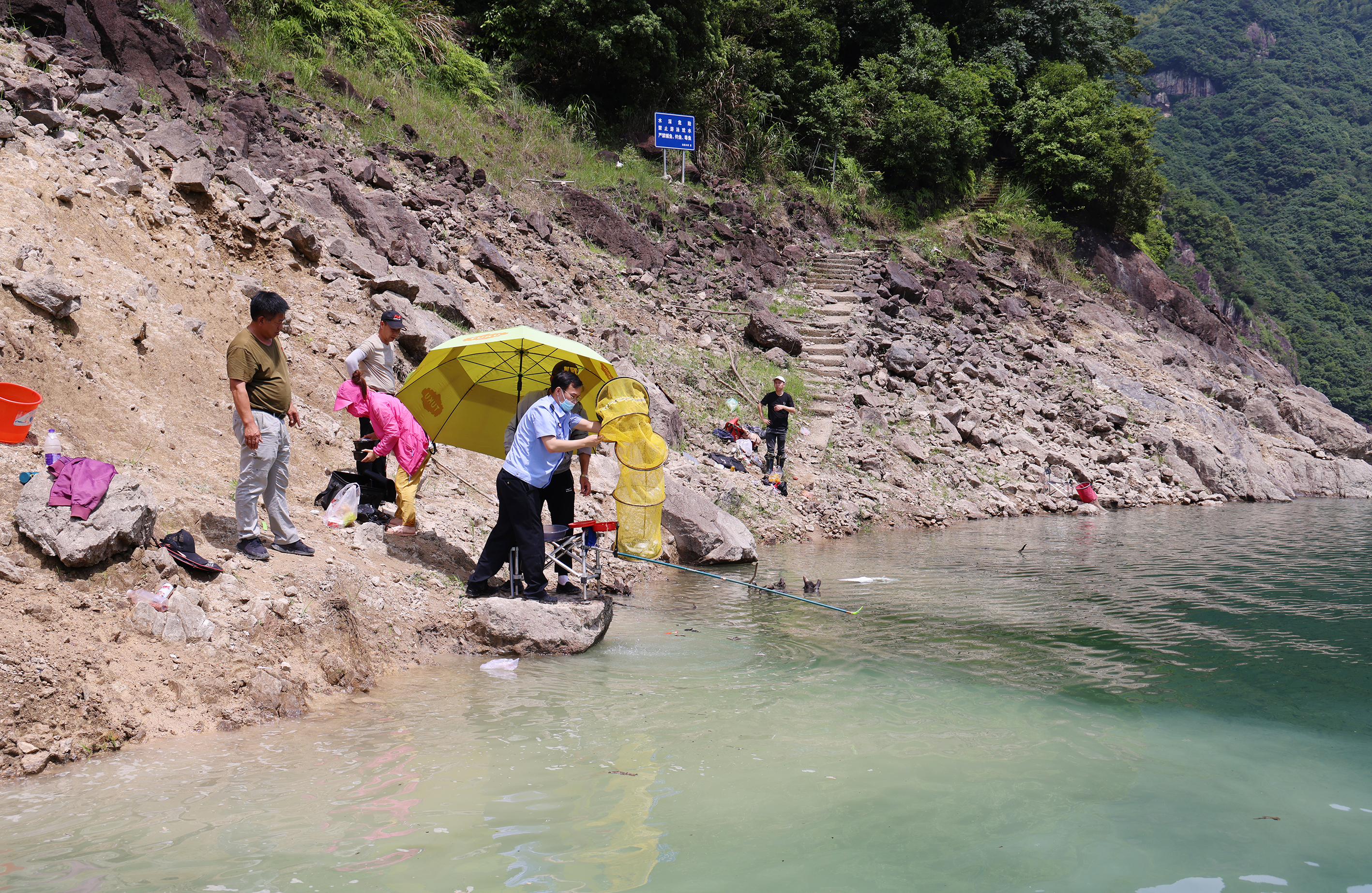 天氣轉暖,接群眾舉報及水庫人員巡查發現,水庫周邊非法釣毒魚事件日益增多,嚴重影響了水庫安全管理及飲用水水質。當天上午,執法人員經過周密部署,出動執法車2輛,巡邏船一艘,采取陸上沿岸巡查、重點多發區域伏擊和發現情況巡邏船水路追擊堵截的方法進行了專項整治。“這里是一級飲用水水源保護區,禁止釣魚!”執法人員持續對現場釣魚者進行喊話教育。經過3小時的全方位覆蓋式巡查,一上午共查處偷釣者10余人,收繳了10余套捕魚設備,當場放生了漁獲物,并對當事人進行嚴厲的批評教育。